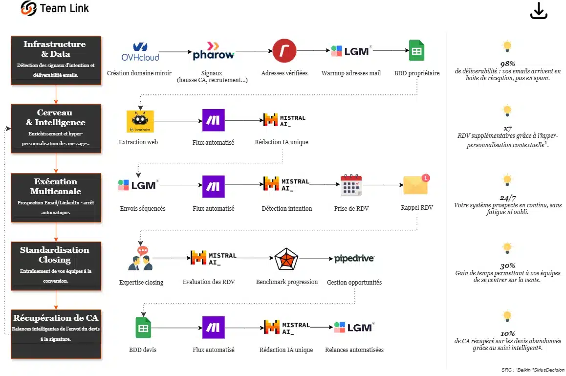 ● Moteur d’Acquisition IA : Création de votre base client par signaux d’intention et infrastructure de prospection intelligente.
